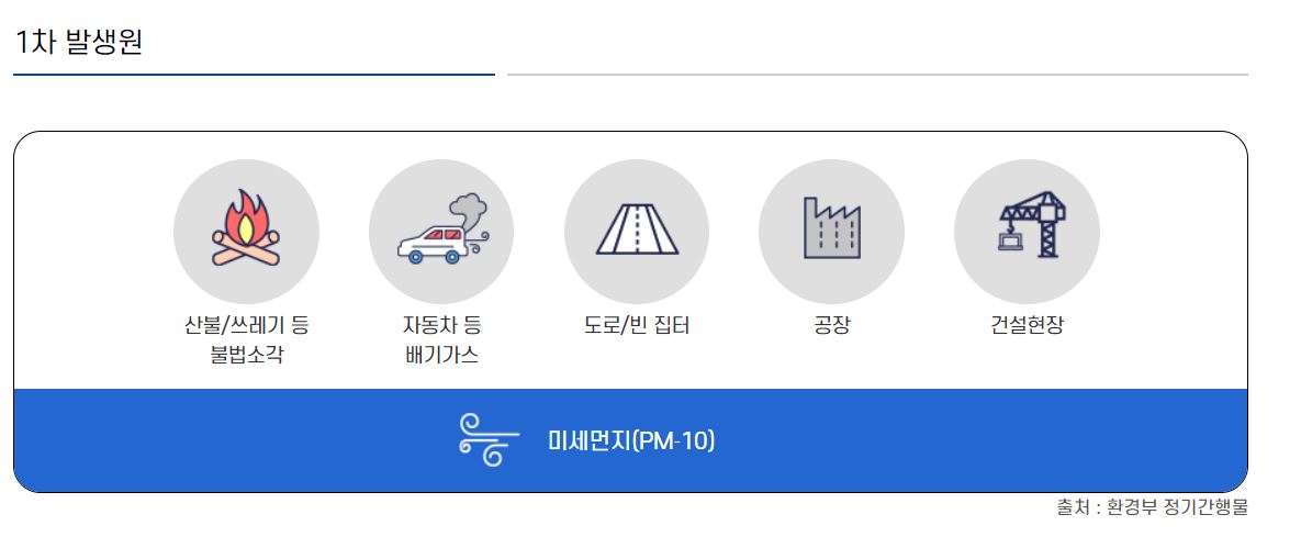 미세먼지 국가정보센터에서 수집한 자료를 바탕으로 미세먼지 발생원을 조사한 결과, 미세먼지 발생원은 토양먼지, 해수염, 식물 꽃가루 등 자연 발생원과 그을음 등 인공 발생원으로 나타났다. 화석연료와 자동차 매연, 건설현장의 비산재, 공장의 분말원료, 부원료 취급의 분말성분, 소각장에서 나오는 연기. 미세먼지의 조성은 지역, 계절, 날씨 등에 따라 달라지며 공기 중의 각종 오염물질, 화석연료 사용으로 인한 탄소, 지표면의 흙 먼지에서 나오는 그을음과 광물이 화학 반응을 일으켜 형성된 덩어리로 구성되어 있습니다. .