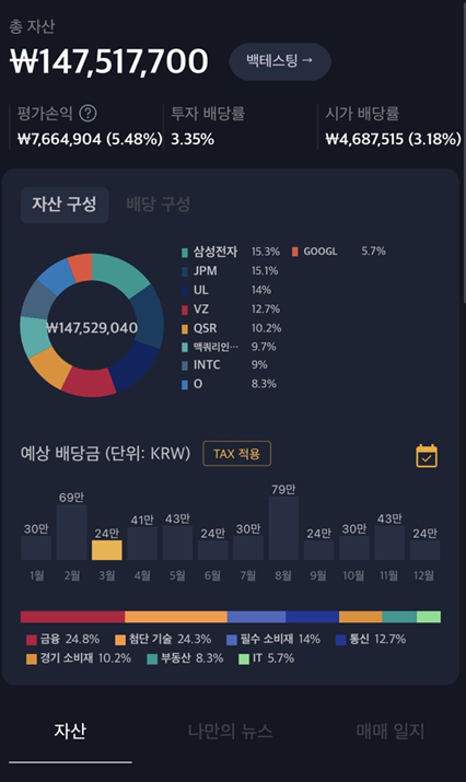 모든 투자사를 연결하기만 하면 직접 입력하지 않아도 총 자산(모든 자산 포함)이 섹터별 포트폴리오로 표시됩니다. 배당일과 월별 배당금액도 표시됩니다. 많은 배당 투자자들이 있습니다. 커뮤니티도 개발 중이며 다른 투자자로부터 투자 통찰력을 학습하여 과신 및 확증 편향에 빠지지 않도록 도와줍니다. 나. 글별 포트폴리오 공유 및 채팅방. 초보자에게 매우 유용한 앱입니다. 컴퓨터에서도 작동합니다.