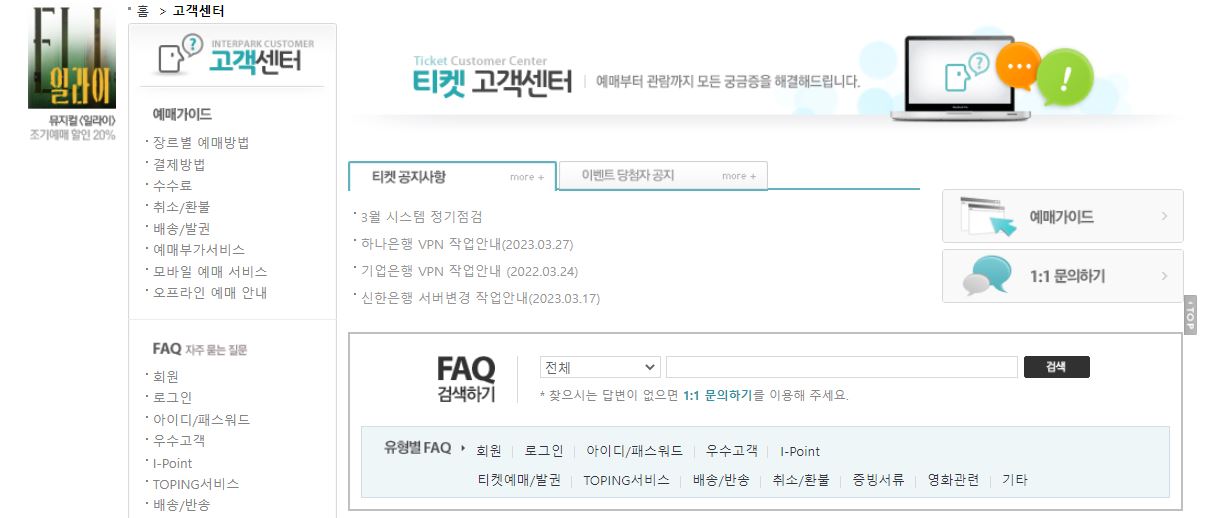 인터파크 티켓 고객센터에서는 1) 대표전화 연결 2) 1:1 문의 3) 자주 묻는 질문(FAQ)을 제공합니다.