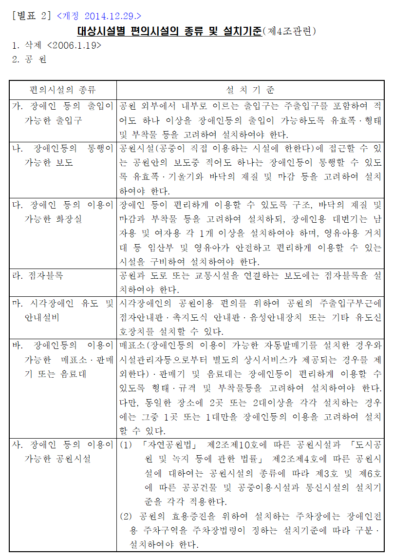 장애인 자격법 시행령 등(별표1)에서 시설 설치가 필요한 시설의 용도를 확인할 수 있으며, (별표2)에서는 장애인 편의시설의 설치 종류 및 기준을 확인할 수 있다. 각 목적.